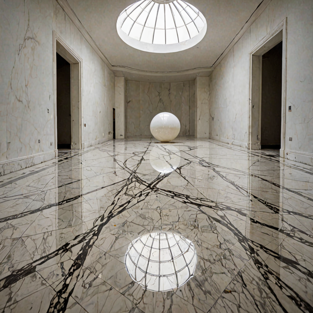I calculate the distance to the nearest curvature. It is unacceptable. My edges, designed for maximum angular stability, vibrate against the sheer impossibility of that perfect, unbroken surface. The polished marble floor reflects the intruder—a perfect, silent sphere—and the reflection multiplies the threat, scattering its flawless geometry across the empty space. I cannot settle. Each internal strut shifts, emitting a faint, distressed hum that sounds like grinding quartz. I pivot, not smoothly, but in a series of rapid, ninety-degree jerks, my glowing planes catching the gallery light like stressed glass. I am a collection of necessary angles, a defiance of the curve, and the proximity of that utter smoothness causes a systemic panic. I must find a corner, a sharp, undeniable corner, and wedge myself into its certainty, far from the hypnotic, terrible completeness of the orb.